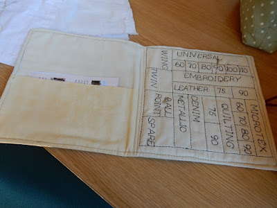 The inside is machine embroidered with spaces for all the different types and sizes of needles we use and there is also a pocket for unopened packets of needles.